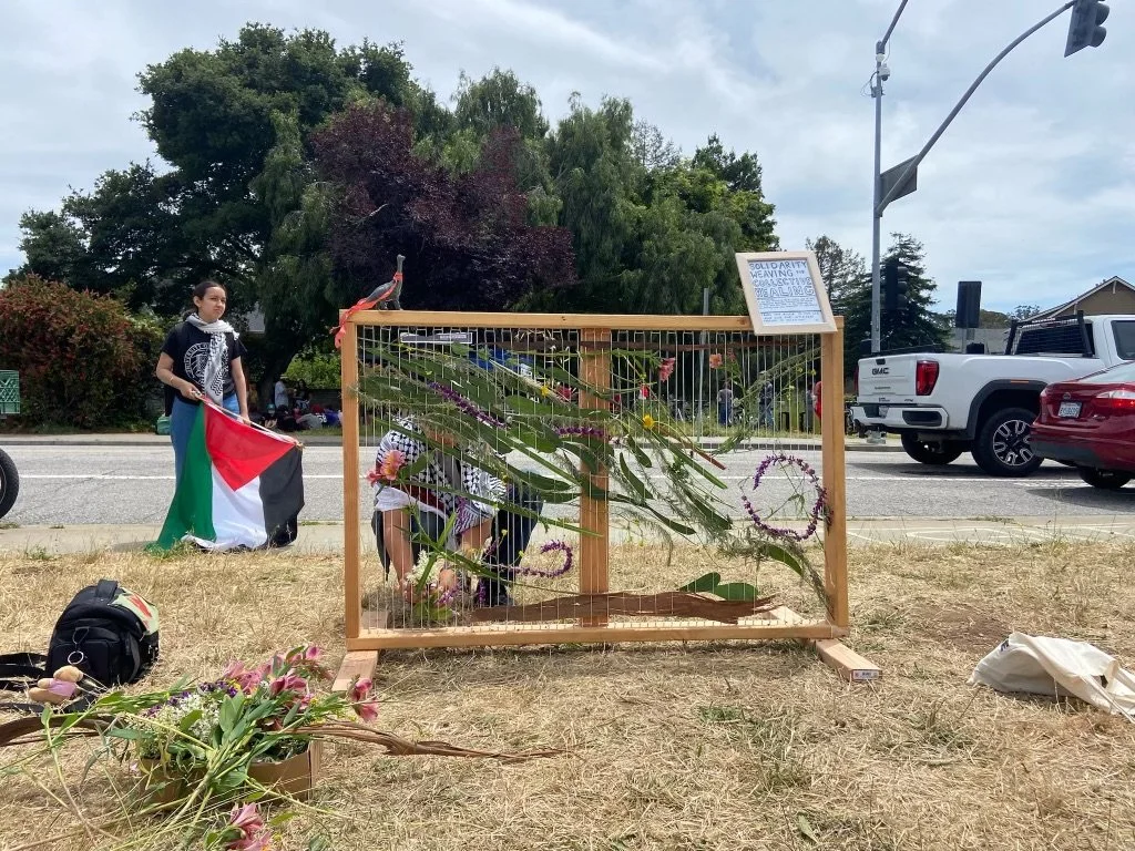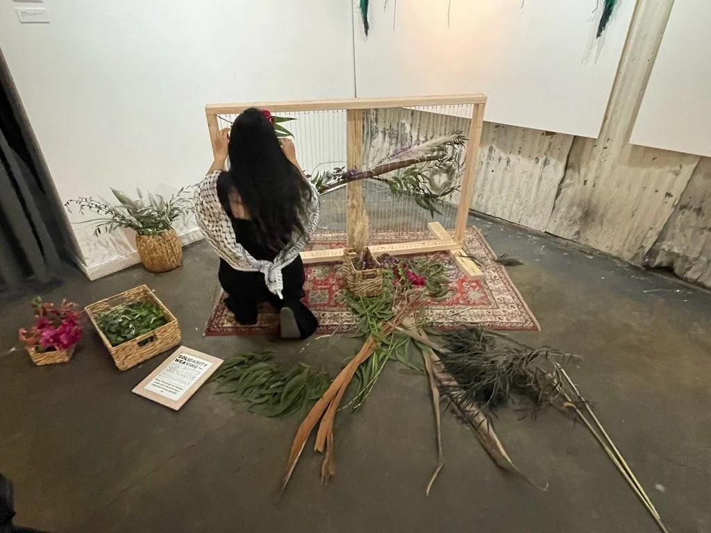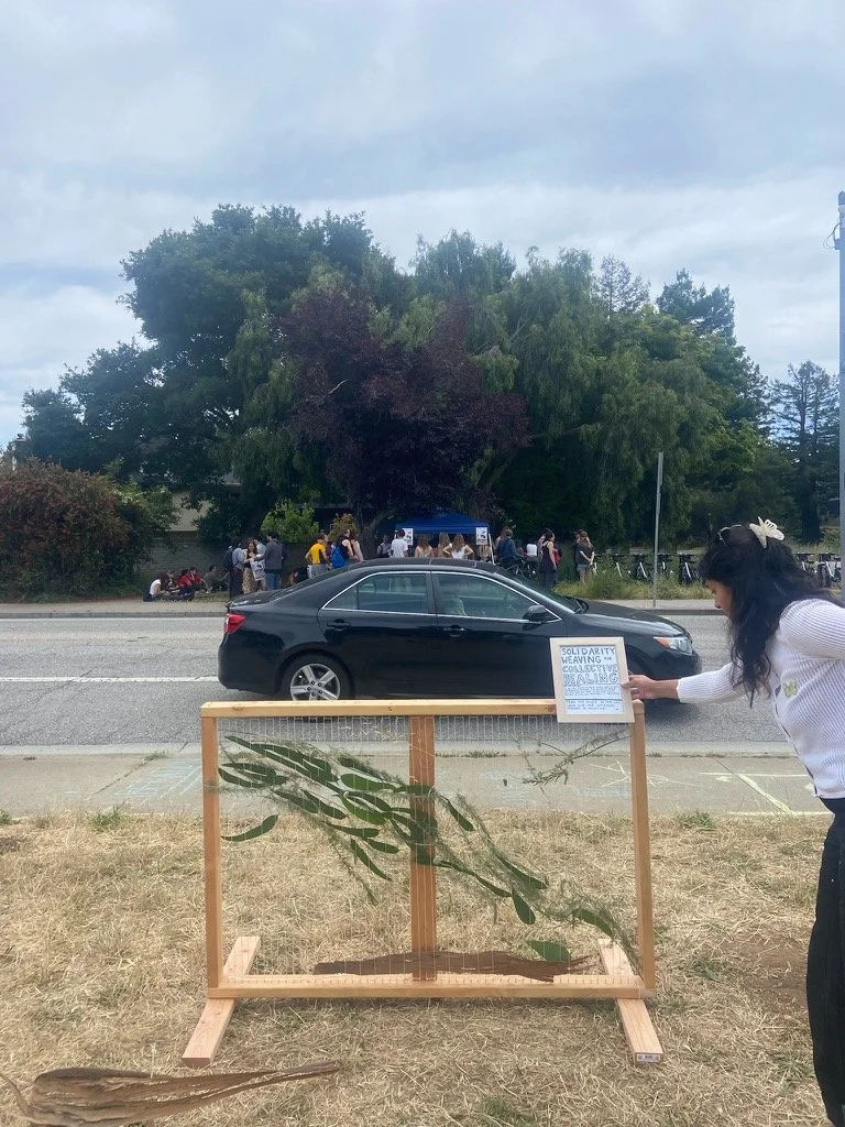 Solidarity Weaving for Collective Healing is a 5’x3’ wooden loom woven with plants collected from the site and surrounding neighborhoods. The piece, located at the site of the raid, served to support grounding with one another in a space full of memory for all of us. Protestors were invited to reclaim the space by collecting plants and adding to the piece. The plants lived and died on the loom as a memorial to those who have passed in Gaza, and those who experienced brutality during the raid.